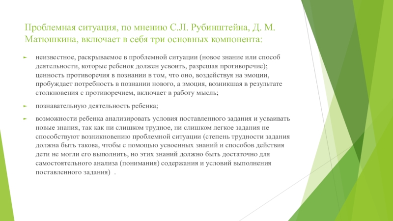 Слайд 16Проблемная ситуация, по мнению С.JI. Рубинштейна, Д. М. Матюшкина, включает в