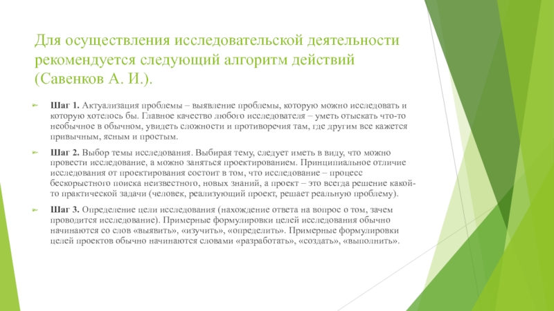 Слайд 10Для осуществления исследовательской деятельности рекомендуется следующий алгоритм действий (Савенков А. И.).