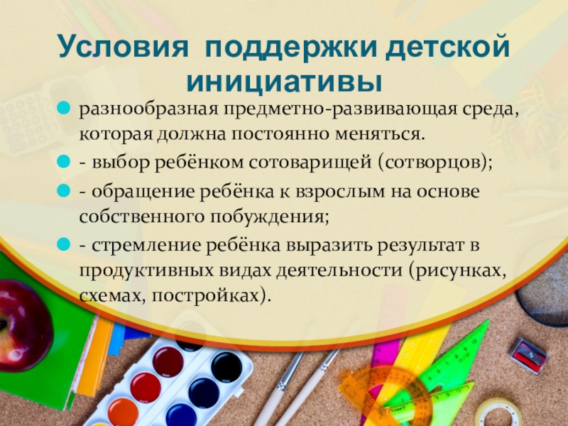 Условия поддержки детской инициативыразнообразная предметно-развивающая среда, которая должна постоянно меняться. - выбор ребёнком сотоварищей (сотворцов);- обращение ребёнка к взрослым на основе собственного побуждения; - стремление ребёнка выразить результат в продуктивных видах деятельности (рисунках, схемах,