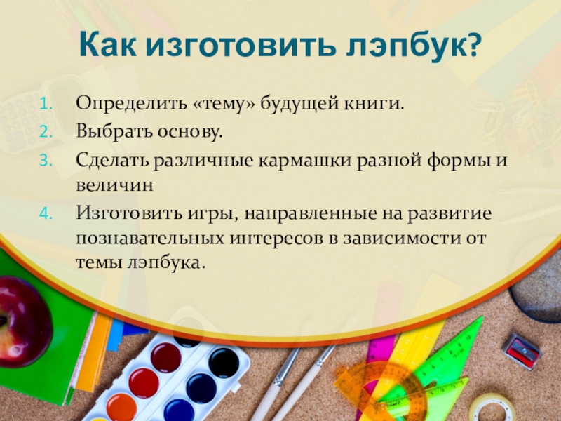 Как изготовить лэпбук?  Определить «тему» будущей книги.Выбрать основу.Сделать различные кармашки разной формы и величинИзготовить игры, направленные