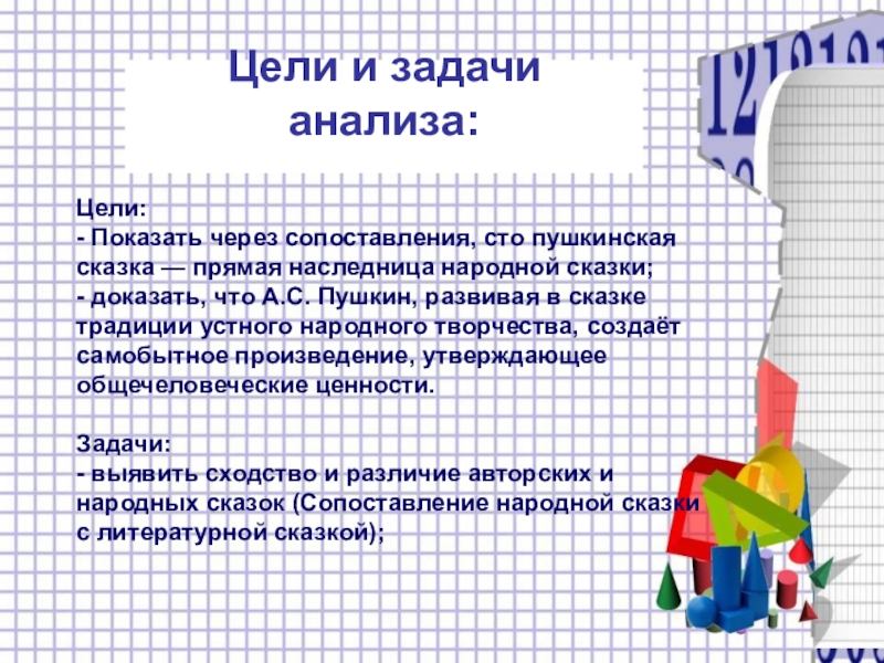 - доказать, что А.С. Пушкин, развивая в сказке традиции устного народного творчества, создаёт самобытное произведение, утверждающее общечеловеческие ценности.
