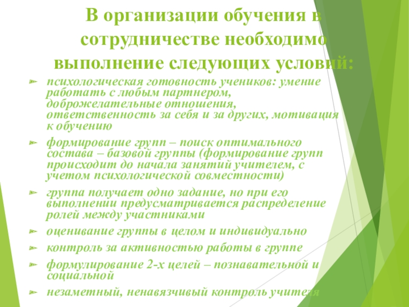 Слайд 7В организации обучения в сотрудничестве необходимо выполнение следующих условий: