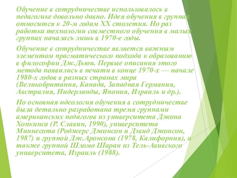 группах относится к 20-м годам XX столетия. Но разработка технологии совместного обучения в малых группах началась лишь в 1970-е годы.