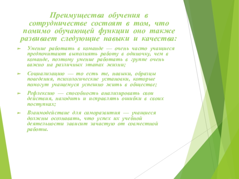 Слайд 8Преимущества обучения в сотрудничестве состоят в том, что помимо обучающей функции