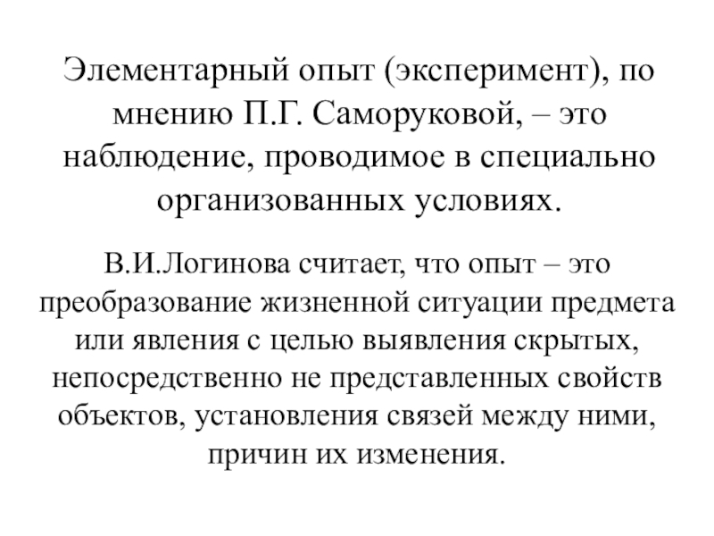 Слайд 2Элементарный опыт (эксперимент), по мнению П.Г. Саморуковой, – это наблюдение, проводимое