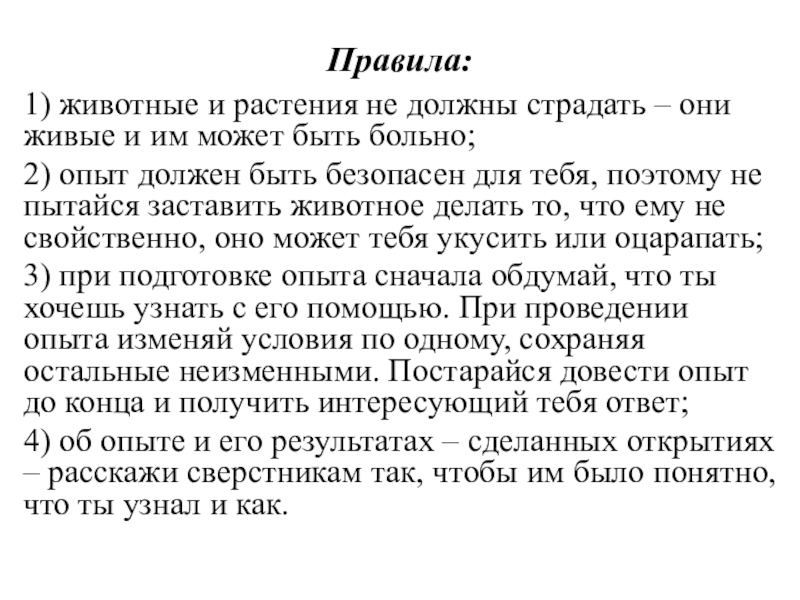 2) опыт должен быть безопасен для тебя, поэтому не пытайся заставить животное делать то, что ему не свойственно, оно может тебя укусить или оцарапать;