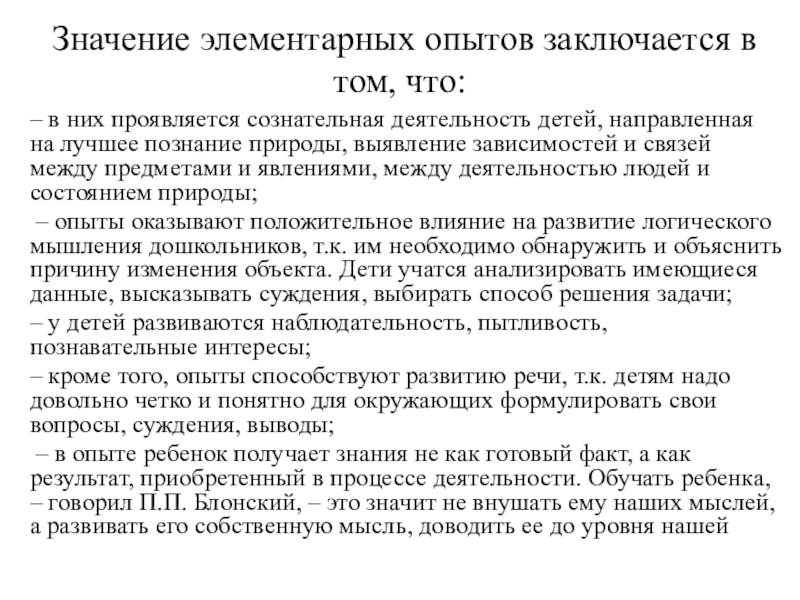 – в опыте ребенок получает знания не как готовый факт, а как результат, приобретенный в процессе деятельности. Обучать ребенка, – говорил П.П. Блонский, – это значит не внушать ему наших мыслей, а развивать его собственную мысль, доводить ее до уровня нашей