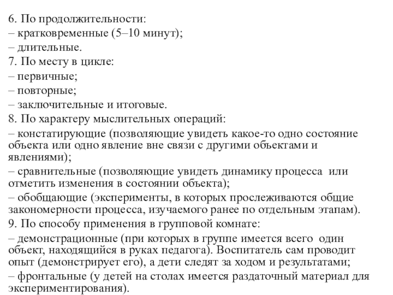 – демонстрационные (при которых в группе имеется всего один объект, находящийся в руках педагога). Воспитатель сам проводит опыт (демонстрирует его), а дети следят за ходом и результатами;