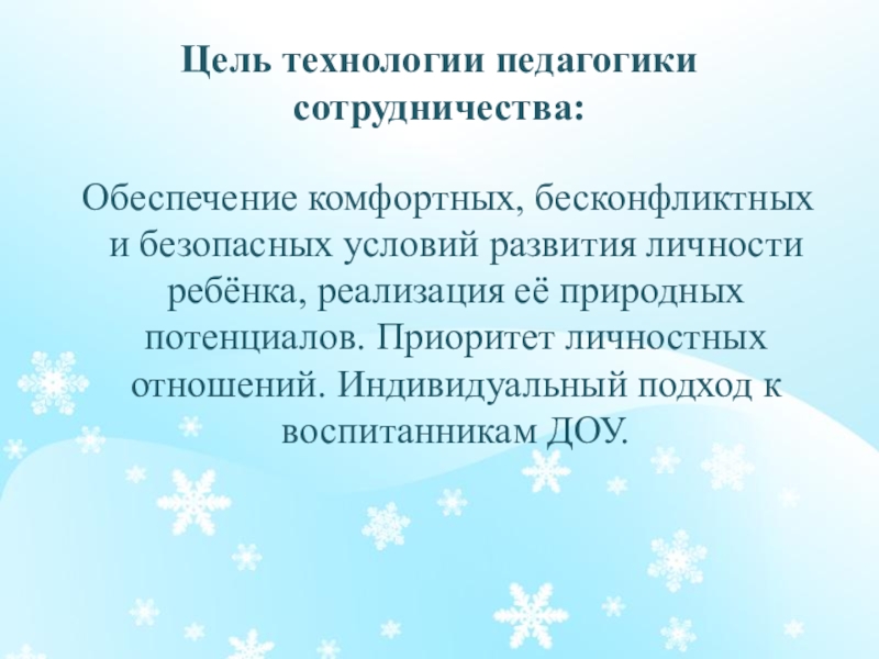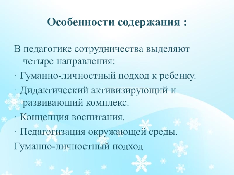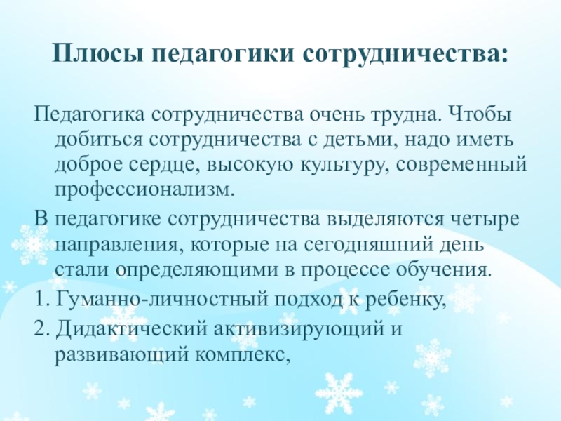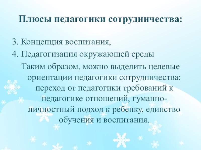 педагогики сотрудничества: переход от педагогики требований к педагогике отношений, гуманно-личностный подход к ребенку, единство обучения и воспитания.
