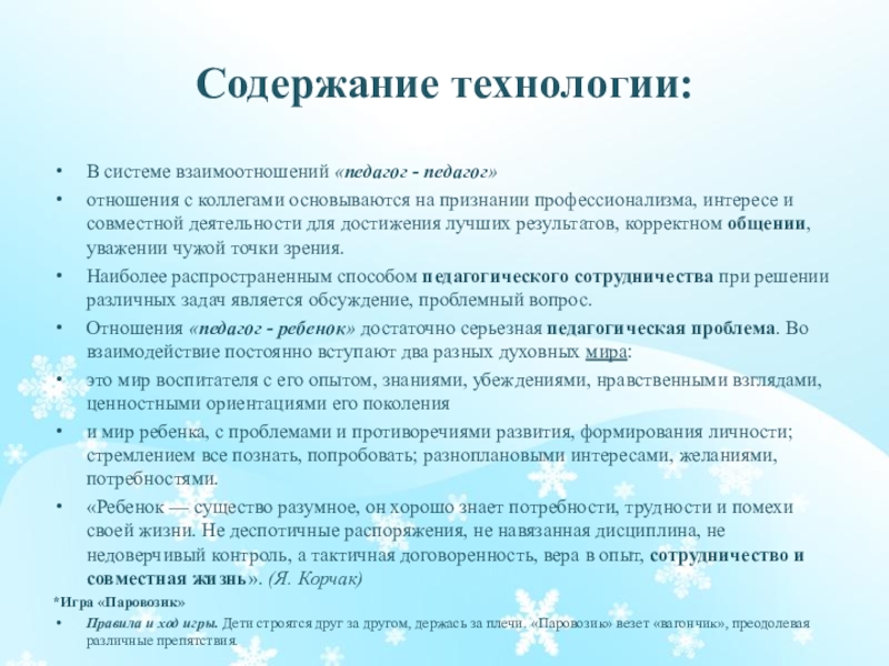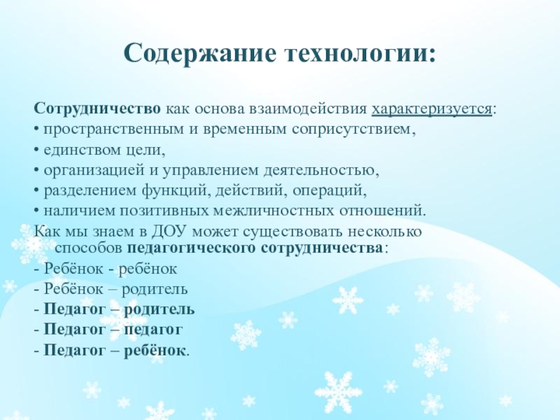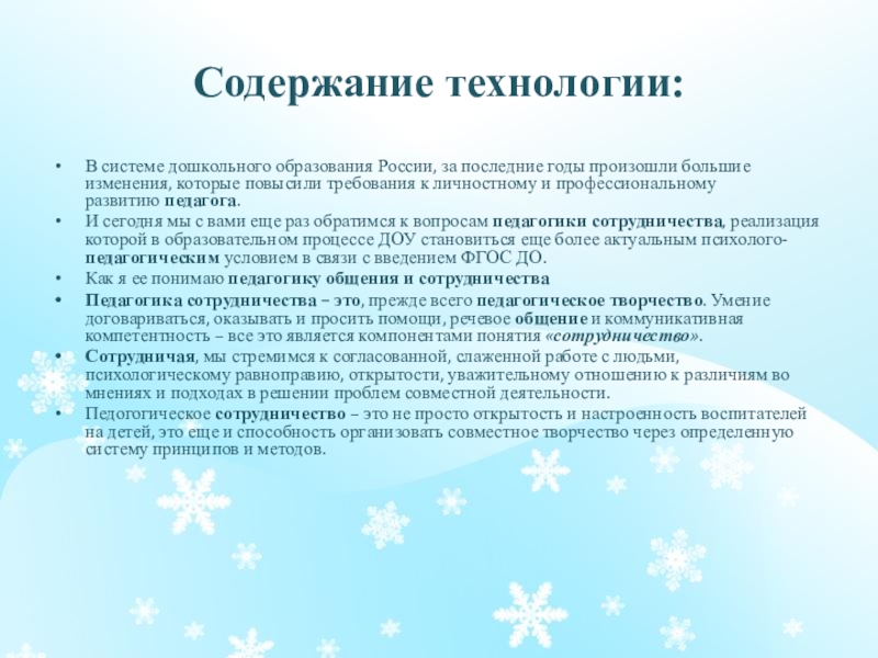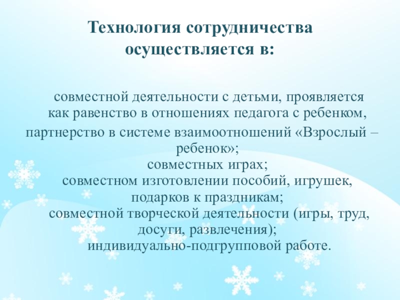 Педогогическое сотрудничество – это не просто открытость и настроенность воспитателей на детей, это еще и способность организовать совместное творчество через определенную систему принципов и методов.