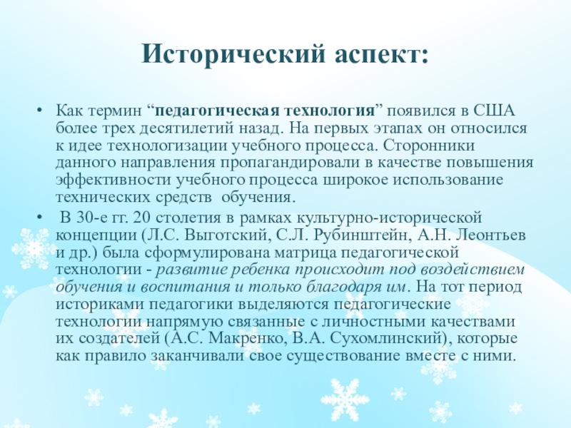 В 30-е гг. 20 столетия в рамках культурно-исторической концепции (Л.С. Выготский, С.Л. Рубинштейн, А.Н. Леонтьев и др.) была сформулирована матрица педагогической технологии - развитие ребенка происходит под воздействием обучения и воспитания и только благодаря им. На тот период историками педагогики выделяются педагогические технологии напрямую связанные с личностными качествами их создателей (А.С. Макренко, В.А. Сухомлинский), которые как правило заканчивали свое существование вместе с ними.