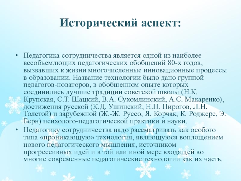годов, вызвавших к жизни многочисленные инновационные процессы в образовании. Название технологии было дано группой педагогов-новаторов, в обобщенном опыте которых соединились лучшие традиции советской школы (Н.К. Крупская, С.Т. Шацкий, В.А. Сухомлинский, А.С. Макаренко), достижения русской (К.Д. Ушинский, Н.П. Пирогов, Л.Н.Толстой) и зарубежной (Ж.-Ж. Руссо, Я. Корчак, К. Роджерс, Э.Берн) психолого-педагогической практики и науки.