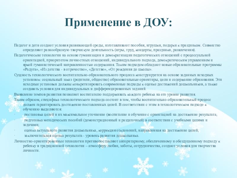 Педагогические технологии на основе гуманизации и демократизации педагогических отношений с процессуальной ориентацией, приоритетом личностных отношений, индивидуального подхода, демократическим управлением и яркой гуманистической направленностью содержания. Таким подходом обладают новые образовательные программы «Радуга», «Из детства - в отрочество», «Детство», «От рождения до школы».