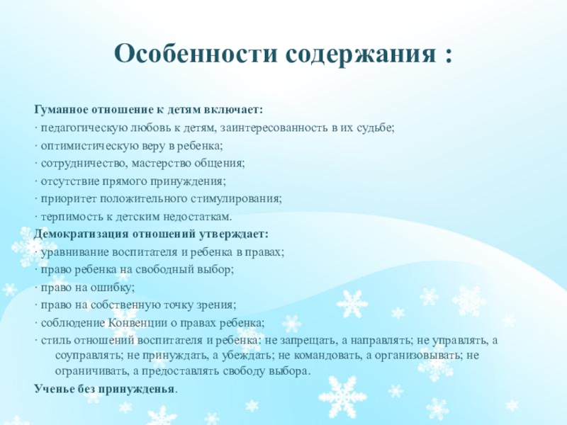 · стиль отношений воспитателя и ребенка: не запрещать, а направлять; не управлять, а соуправлять; не принуждать, а убеждать; не командовать, а организовывать; не ограничивать, а предоставлять свободу выбора.