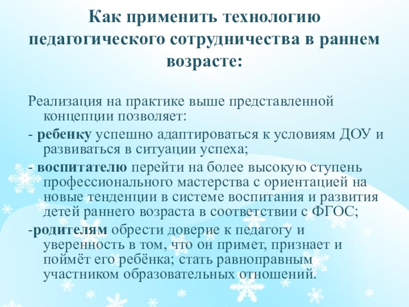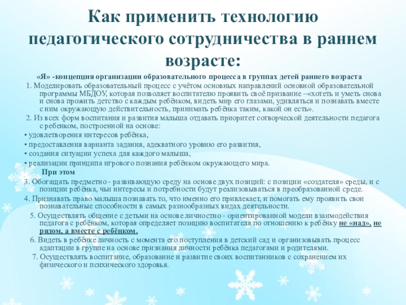 Слайд 11Как применить технологию педагогического сотрудничества в раннем возрасте: