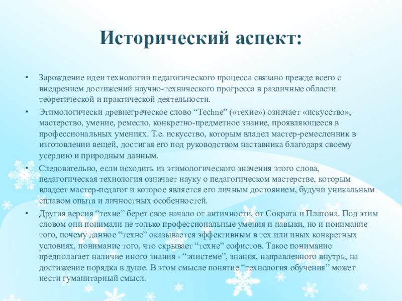 Другая версия “техне” берет свое начало от античности, от Сократа и Платона. Под этим словом они понимали не только профессиональные умения и навыки, но и понимание того, почему данное “техне” оказывается эффективным в тех или иных конкретных условиях, понимание того, что скрывает “техне” софистов. Такое понимание предполагает наличие иного знания - “эпистеме”, знания, направленного внутрь, на достижение порядка в душе. В этом смысле понятие “технология обучения” может нести гуманитарный смысл.