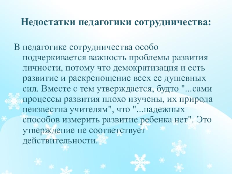 демократизация и есть развитие и раскрепощение всех ее душевных сил. Вместе с тем утверждается, будто "...сами процессы развития плохо изучены, их природа неизвестна учителям", что "...надежных способов измерить развитие ребенка нет". Это утверждение не соответствует действительности.