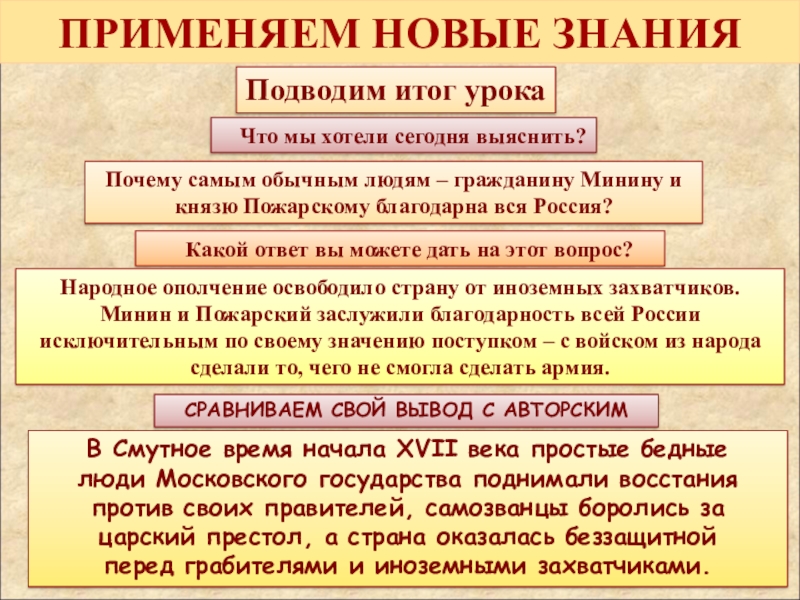 Народное ополчение освободило страну от иноземных захватчиков. Минин и Пожарский заслужили благодарность всей России исключительным по своему значению поступком – с войском из народа сделали то, чего не смогла сделать армия.