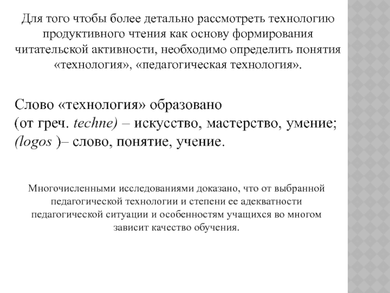 Для того чтобы более детально рассмотреть технологию продуктивного чтения как основу формирования читательской активности, необходимо определить понятия «технология», «педагогическая технология».