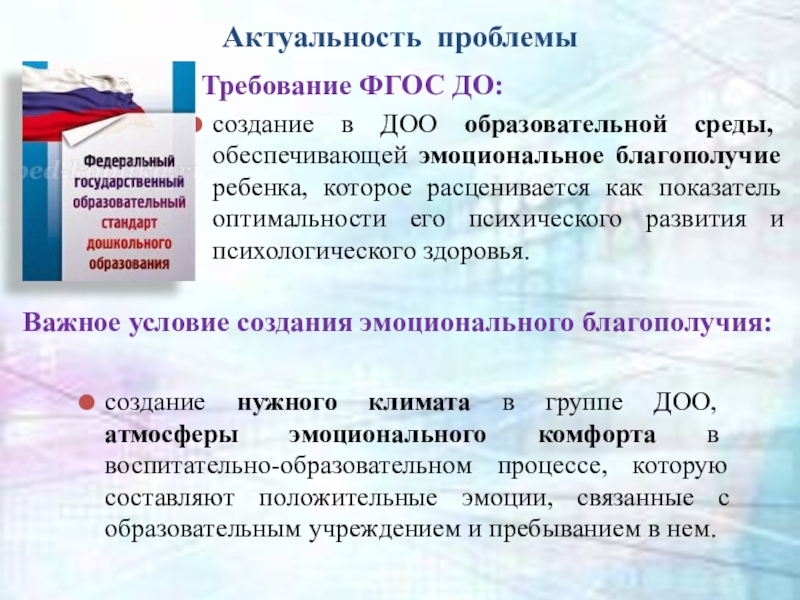 создание нужного климата в группе ДОО, атмосферы эмоционального комфорта в воспитательно-образовательном процессе, которую составляют положительные эмоции, связанные с образовательным учреждением и пребыванием в нем.