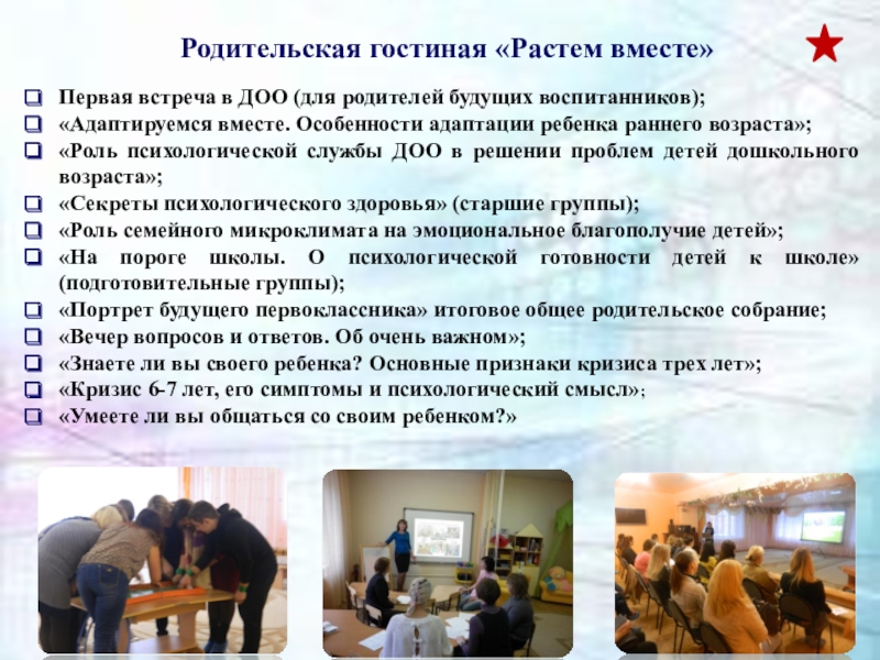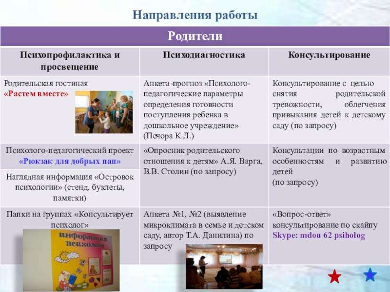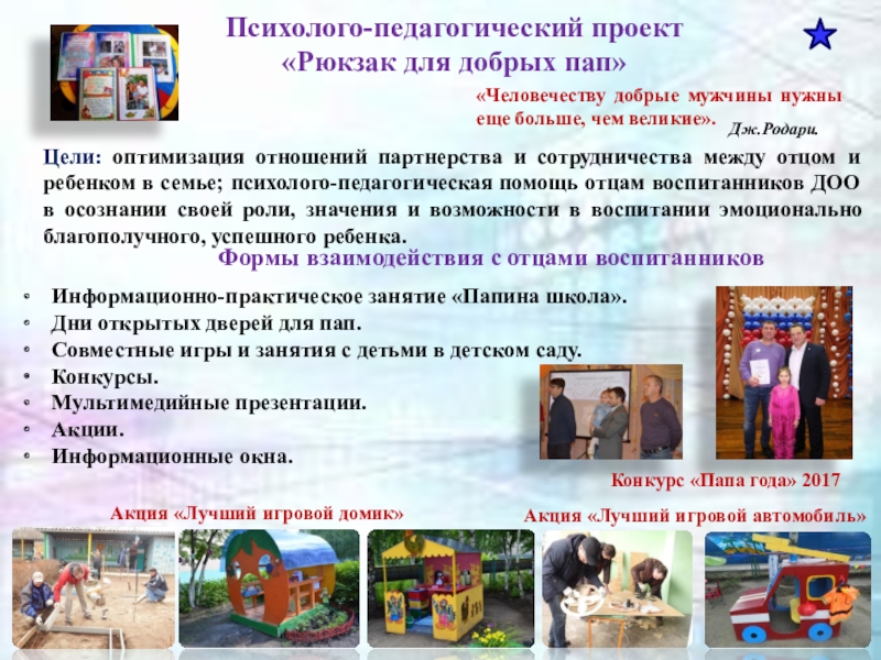 Цели: оптимизация отношений партнерства и сотрудничества между отцом и ребенком в семье; психолого-педагогическая помощь отцам воспитанников ДОО в осознании своей роли, значения и возможности в воспитании эмоционально благополучного, успешного ребенка.