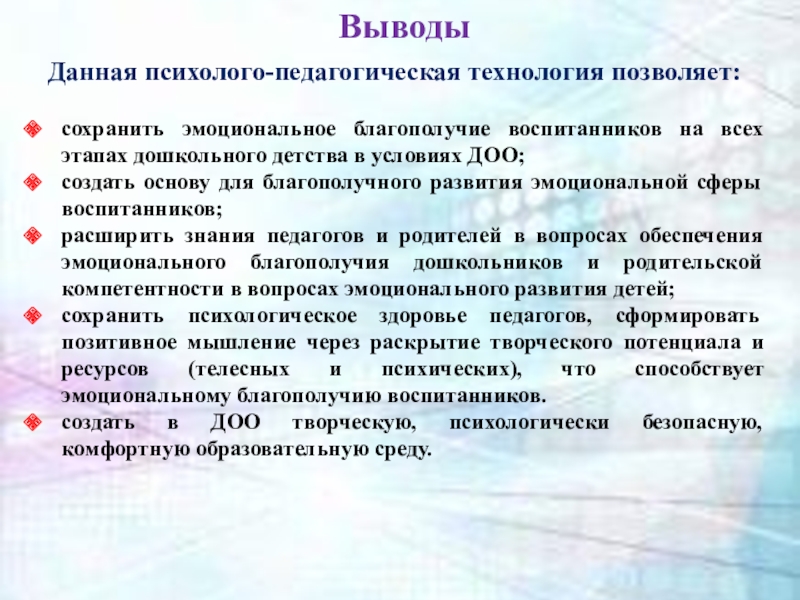 по созданию психолого-педагогических условий для обеспечения эмоционального благополучия воспитанников в условиях дошкольной образовательной организации