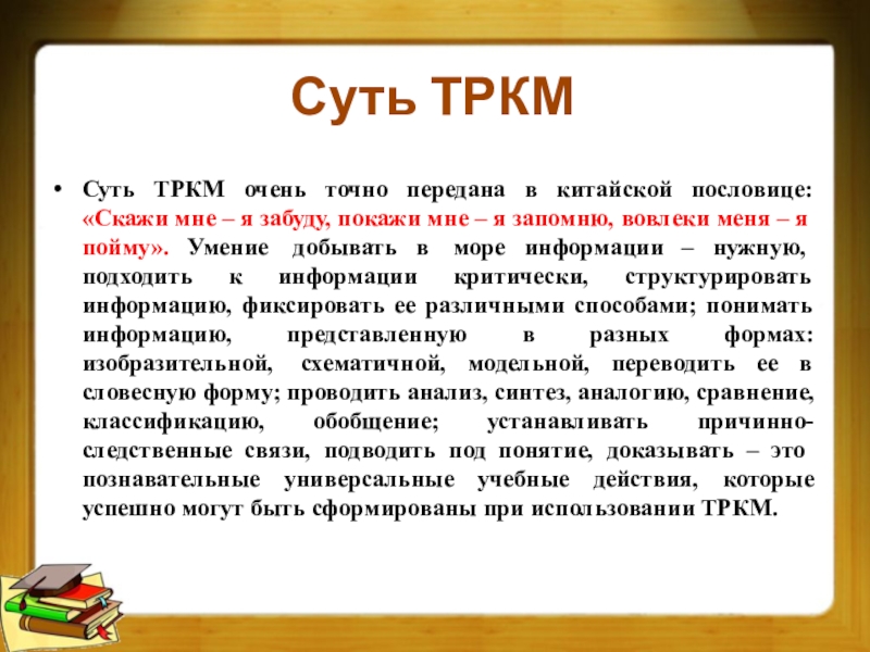 – я забуду, покажи мне – я запомню, вовлеки меня – я пойму». Умение добывать в море информации – нужную, подходить к информации критически, структурировать информацию, фиксировать ее различными способами; понимать информацию, представленную в разных формах: изобразительной, схематичной, модельной, переводить ее в словесную форму; проводить анализ, синтез, аналогию, сравнение, классификацию, обобщение; устанавливать причинно-следственные связи, подводить под понятие, доказывать – это познавательные универсальные учебные действия, которые успешно могут быть сформированы при использовании ТРКМ.