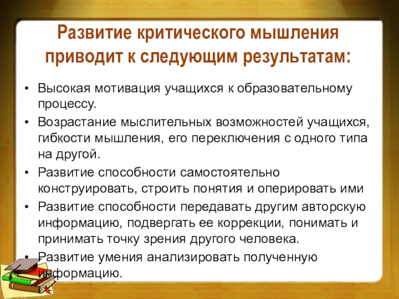 Слайд 7Развитие критического мышления приводит к следующим результатам: