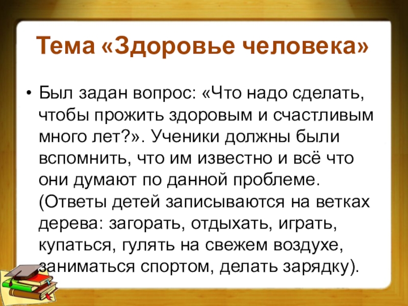 и счастливым много лет?». Ученики должны были вспомнить, что им известно и всё что они думают по данной проблеме. (Ответы детей записываются на ветках дерева: загорать, отдыхать, играть, купаться, гулять на свежем воздухе, заниматься спортом, делать зарядку).