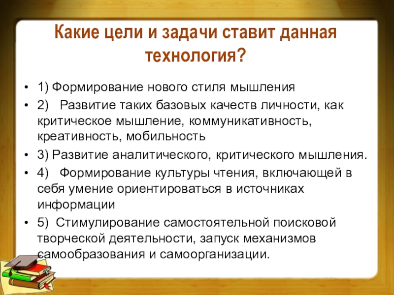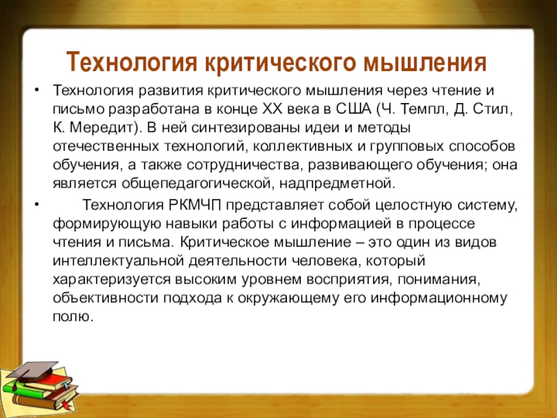 Технология РКМЧП представляет собой целостную систему, формирующую навыки работы с информацией в процессе чтения и письма. Критическое мышление – это один из видов интеллектуальной деятельности человека, который характеризуется высоким уровнем восприятия, понимания, объективности подхода к окружающему его информационному полю.