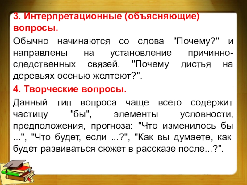 3. Интерпретационные (объясняющие) вопросы.