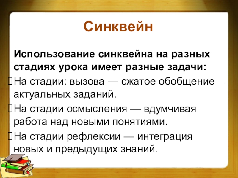 Использование синквейна на разных стадиях урока имеет разные задачи: