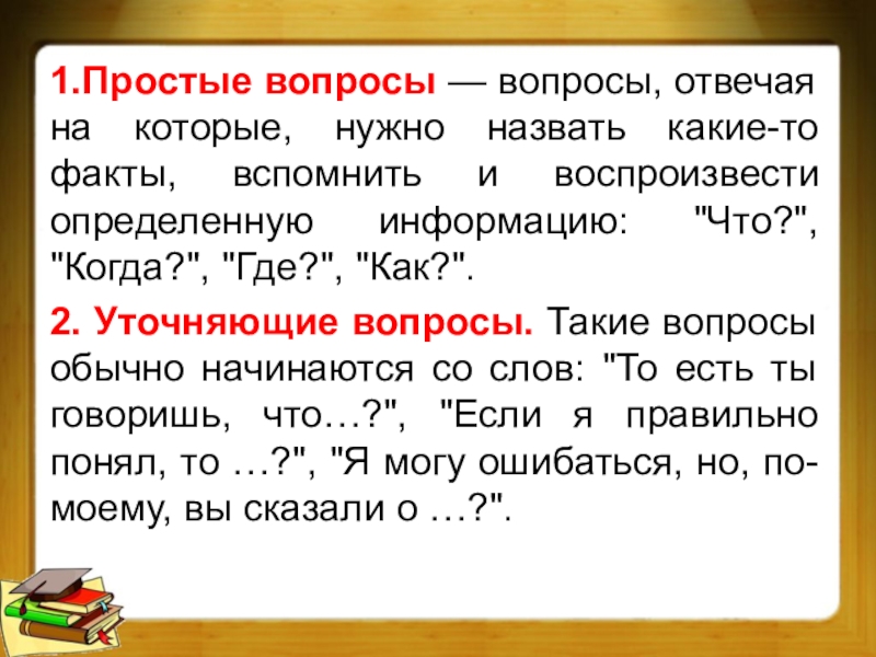 1.Простые вопросы — вопросы, отвечая на которые, нужно назвать какие-то факты,