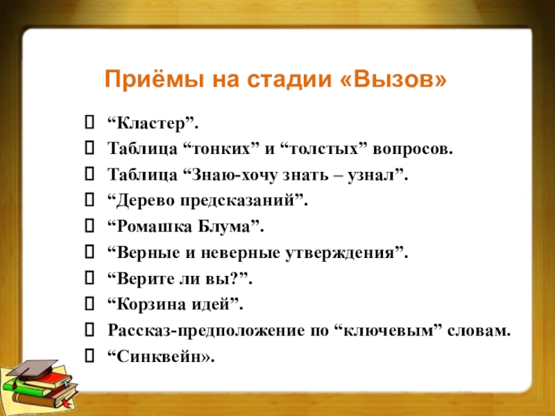 Слайд 11Приёмы на стадии «Вызов»