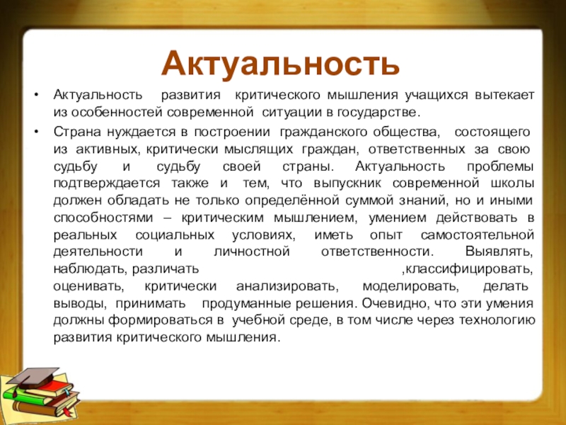 Страна нуждается в построении гражданского общества, состоящего из активных, критически мыслящих граждан, ответственных за свою судьбу и судьбу своей страны. Актуальность проблемы подтверждается также и тем, что выпускник современной школы должен обладать не только определённой суммой знаний, но и иными способностями – критическим мышлением, умением действовать в реальных социальных условиях, иметь опыт самостоятельной деятельности и личностной ответственности. Выявлять, наблюдать, различать ,классифицировать, оценивать, критически анализировать, моделировать, делать выводы, принимать продуманные решения. Очевидно, что эти умения должны формироваться в учебной среде, в том числе через технологию развития критического мышления.