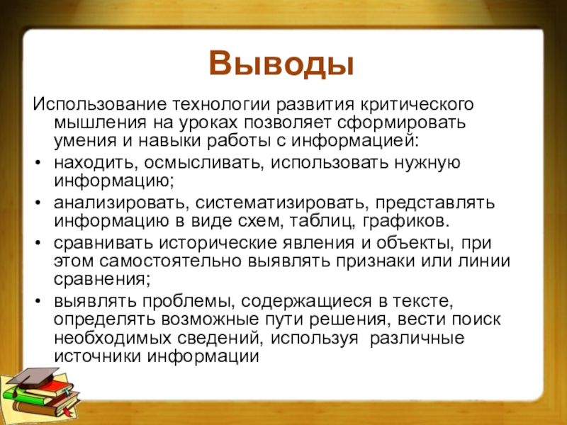 Использование технологии развития критического мышления на уроках позволяет сформировать умения и