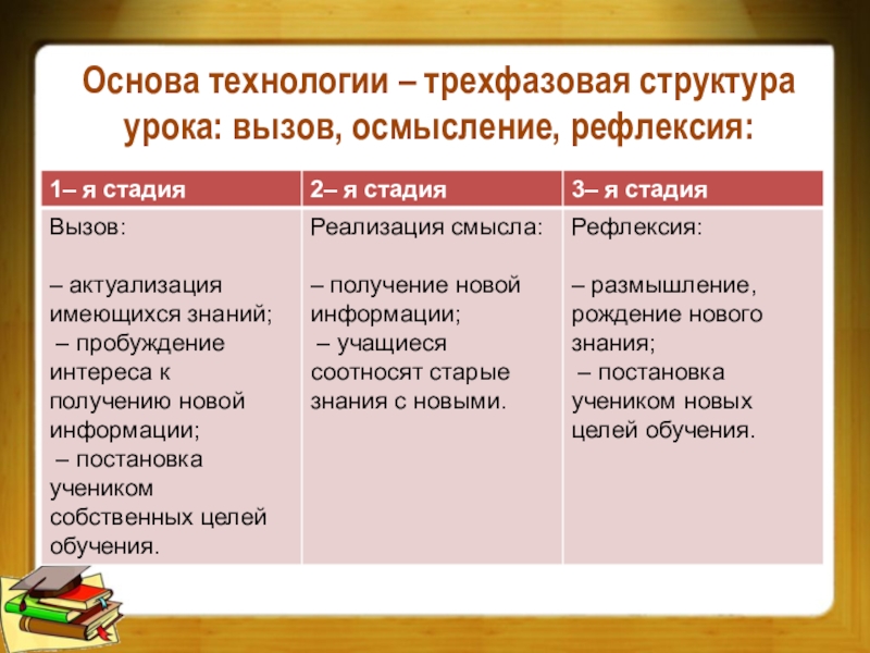 Слайд 8Основа технологии – трехфазовая структура урока: вызов, осмысление, рефлексия: