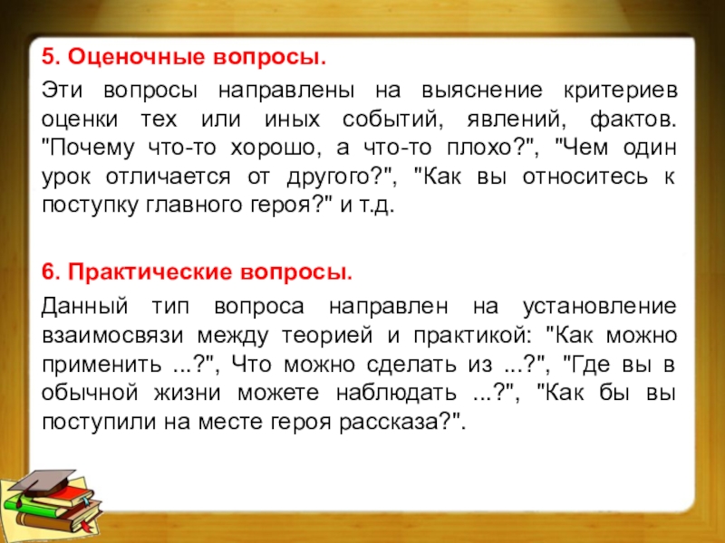 или иных событий, явлений, фактов. "Почему что-то хорошо, а что-то плохо?", "Чем один урок отличается от другого?", "Как вы относитесь к поступку главного героя?" и т.д.
