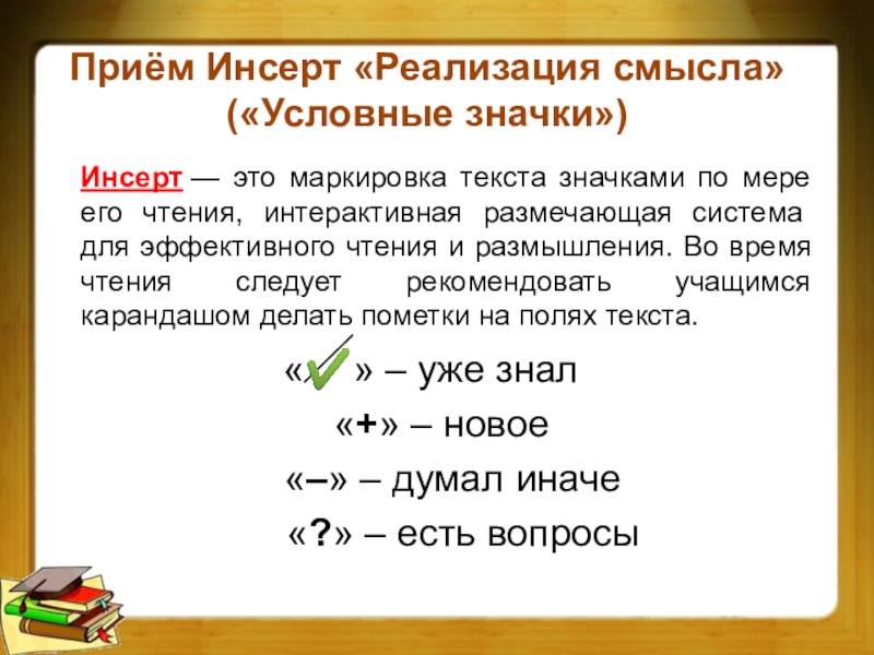 Инсерт — это маркировка текста значками по мере его чтения, интерактивная размечающая система для эффективного чтения и размышления. Во время чтения следует рекомендовать учащимся карандашом делать пометки на полях текста.