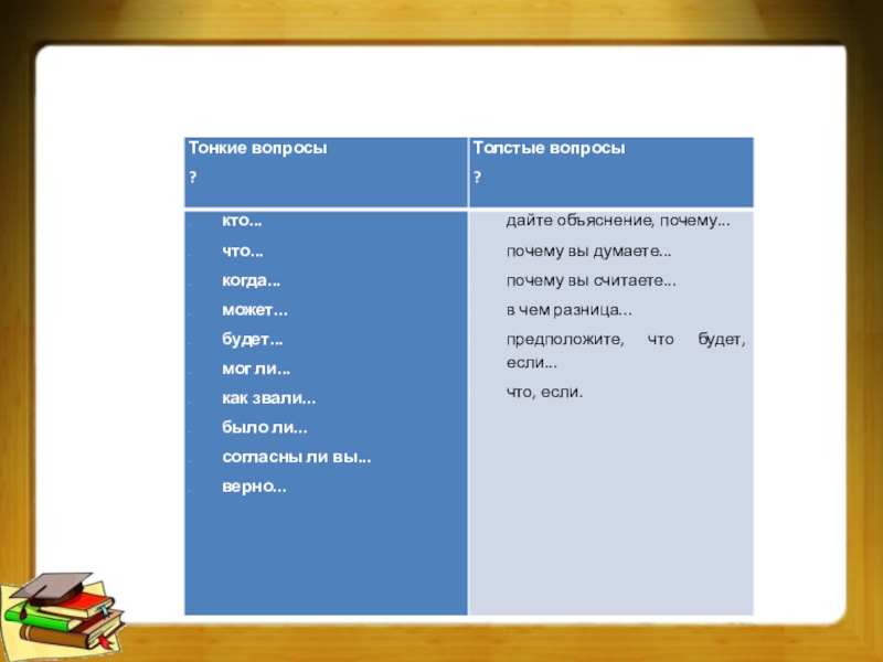 Слайд 23Таблица «толстых и тонких вопросов»