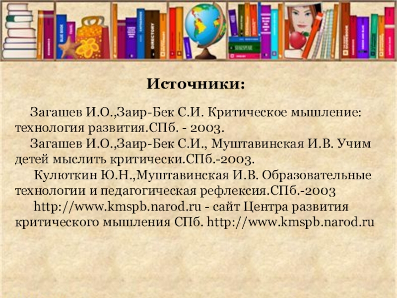 Загашев И.О.,Заир-Бек С.И. Критическое мышление: технология развития.СПб. - 2003.