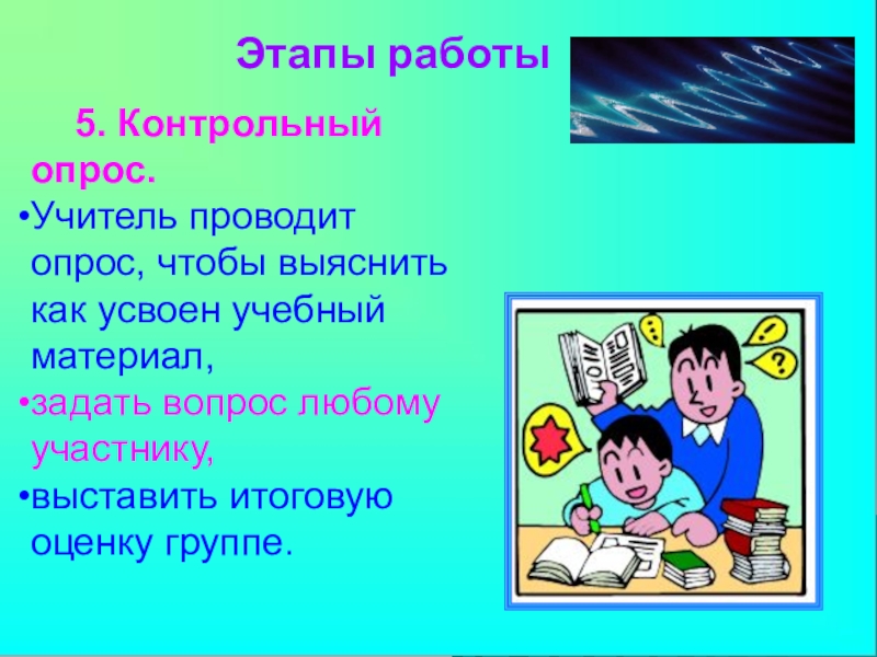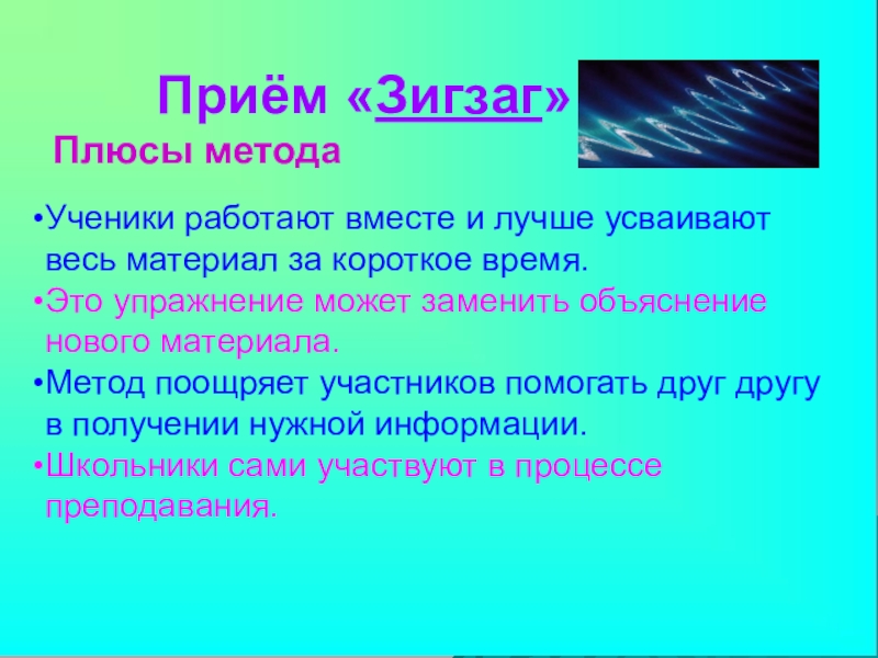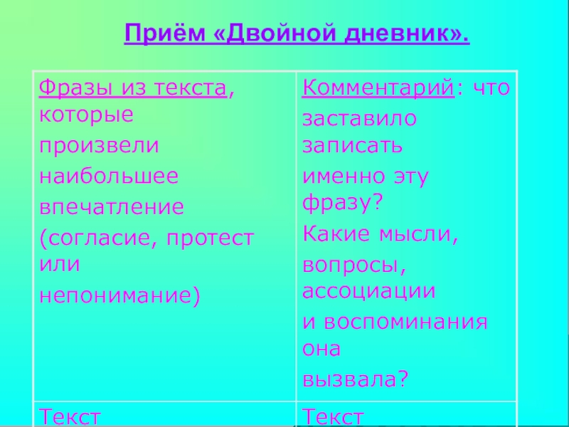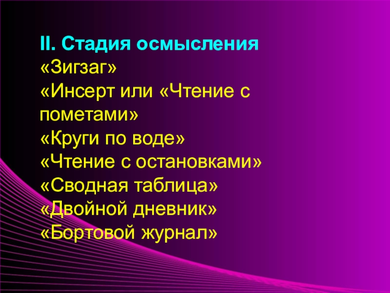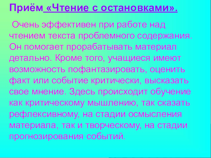 эффективен при работе над чтением текста проблемного содержания. Он помогает прорабатывать материал детально. Кроме того, учащиеся имеют возможность пофантазировать, оценить факт или событие критически, высказать свое мнение. Здесь происходит обучение как критическому мышлению, так сказать рефлексивному, на стадии осмысления материала, так и творческому, на стадии прогнозирования событий.