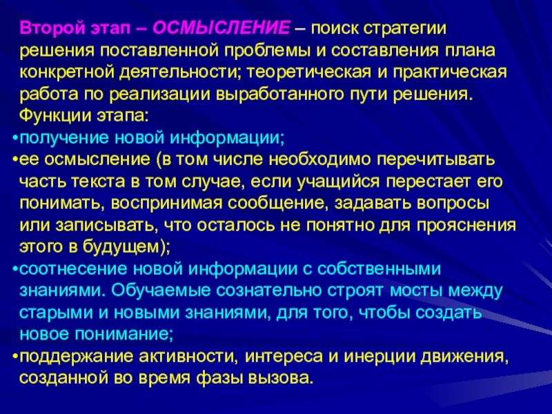 Слайд 6Второй этап – ОСМЫСЛЕНИЕ – поиск стратегии решения поставленной проблемы и составления