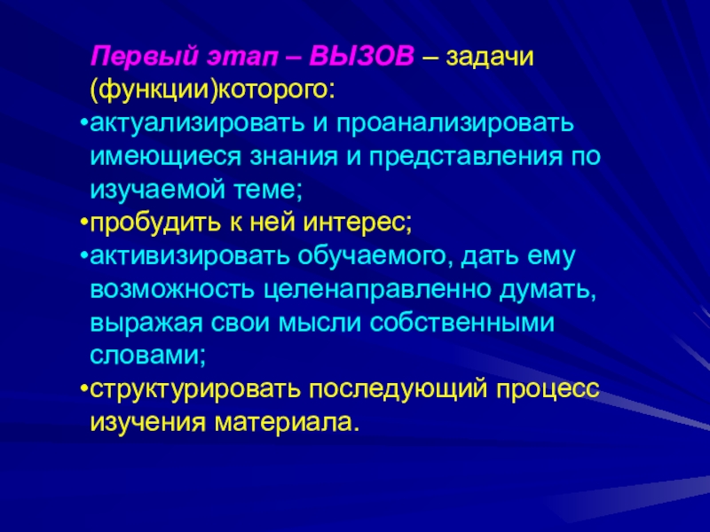 Слайд 5Первый этап – ВЫЗОВ – задачи (функции)которого: