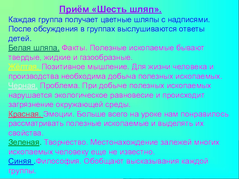 Каждая группа получает цветные шляпы с надписями. После обсуждения в группах выслушиваются ответы детей.