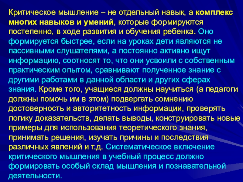 которые формируются постепенно, в ходе развития и обучения ребенка. Оно формируется быстрее, если на уроках дети являются не пассивными слушателями, а постоянно активно ищут информацию, соотносят то, что они усвоили с собственным практическим опытом, сравнивают полученное знание с другими работами в данной области и других сферах знания. Кроме того, учащиеся должны научиться (а педагоги должны помочь им в этом) подвергать сомнению достоверность и авторитетность информации, проверять логику доказательств, делать выводы, конструировать новые примеры для использования теоретического знания, принимать решения, изучать причины и последствия различных явлений и т.д. Систематическое включение критического мышления в учебный процесс должно формировать особый склад мышления и познавательной деятельности.