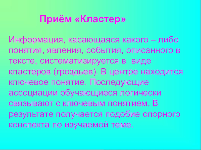 – либо понятия, явления, события, описанного в тексте, систематизируется в виде кластеров (гроздьев). В центре находится ключевое понятие. Последующие ассоциации обучающиеся логически связывают с ключевым понятием. В результате получается подобие опорного конспекта по изучаемой теме.