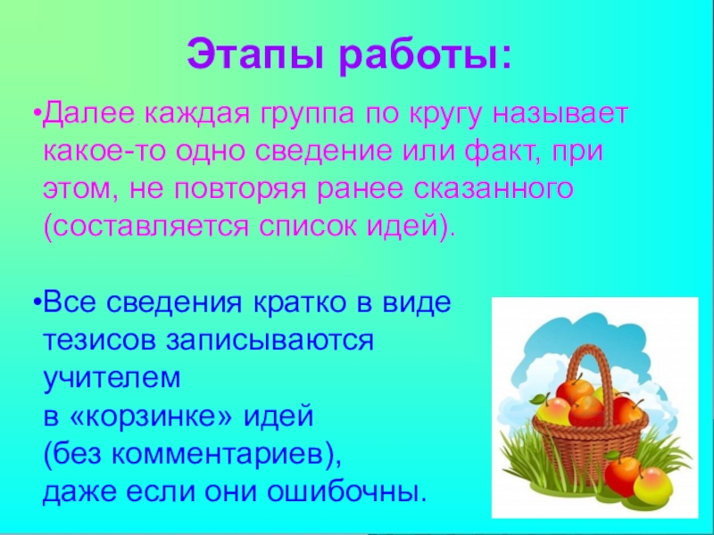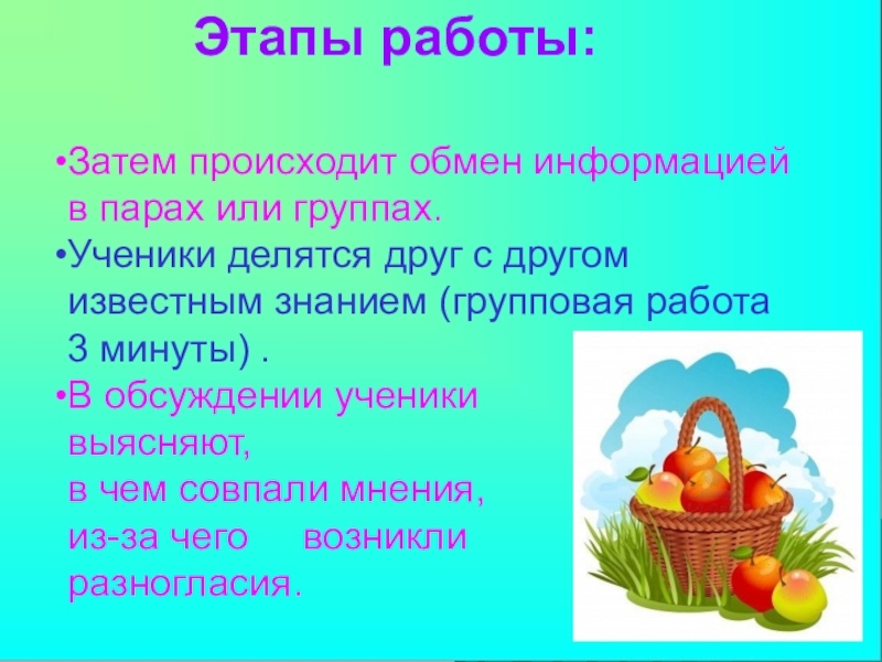 Ученики делятся друг с другом известным знанием (групповая работа 3 минуты) .