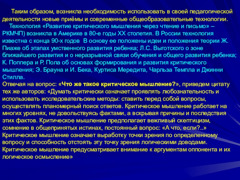 Технология «Развитие критического мышления через чтение и письмо» – РКМЧП) возникла в Америке в 80-е годы ХХ столетия. В России технология известна с конца 90-х годов В основу ее положены идеи и положения теории Ж. Пиаже об этапах умственного развития ребенка; Л.С. Выготского о зоне ближайшего развития и о неразрывной связи обучения и общего развития ребенка; К. Поппера и Р. Пола об основах формирования и развития критического мышления; Э. Брауна и И. Бека, Куртиса Мередита, Чарльза Темпла и Джинни Стилла.