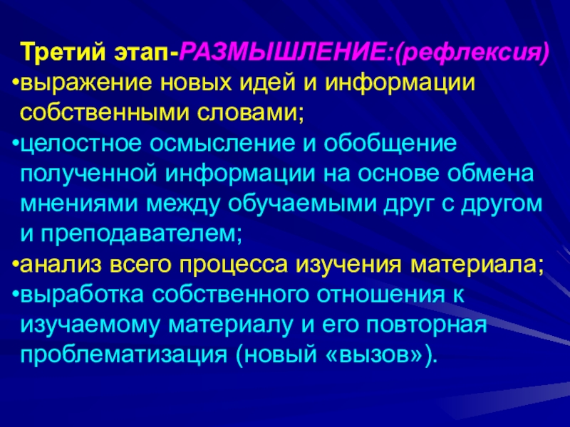 Слайд 7Третий этап-РАЗМЫШЛЕНИЕ:(рефлексия)